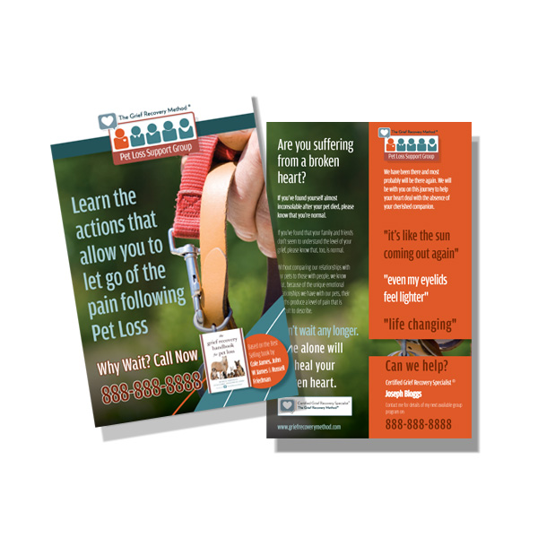 Flyers are an ideal way to reach a wide audience about your upcoming Grief Recovery Method program, and can be handed out to your local community. Our flyers are printed vertically and have a high quality appearance and feel. These are customized flyers with your name and contact information, including your GRM Micro-site URL (for those who have one).